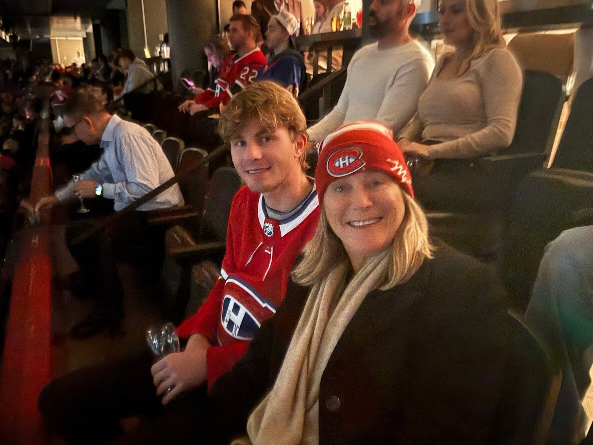 That evening we put on Canadiens gear and drove to the Bell Centre. Guy parked underground and we went straight in. The seats were at center ice. There was a buffet and a bartender nearby. The game stayed one-sided. Montreal won four to nothing. Retired players stopped by our section and talked for a while.